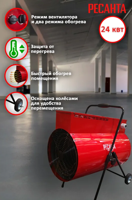 Тепловая пушка Ресанта ТЭП-24000К (круглая) – это наиболее мощный обогреватель в данном семействе, рассчитанный на обслуживание производственных и складских помещений большой площади. Тепловая пушка представлена в качественном металлическом корпусе, оснащена ручкой и колесиками для транспортировки. Модель имеет два режима нагрева и оснащена механическим термостатом.